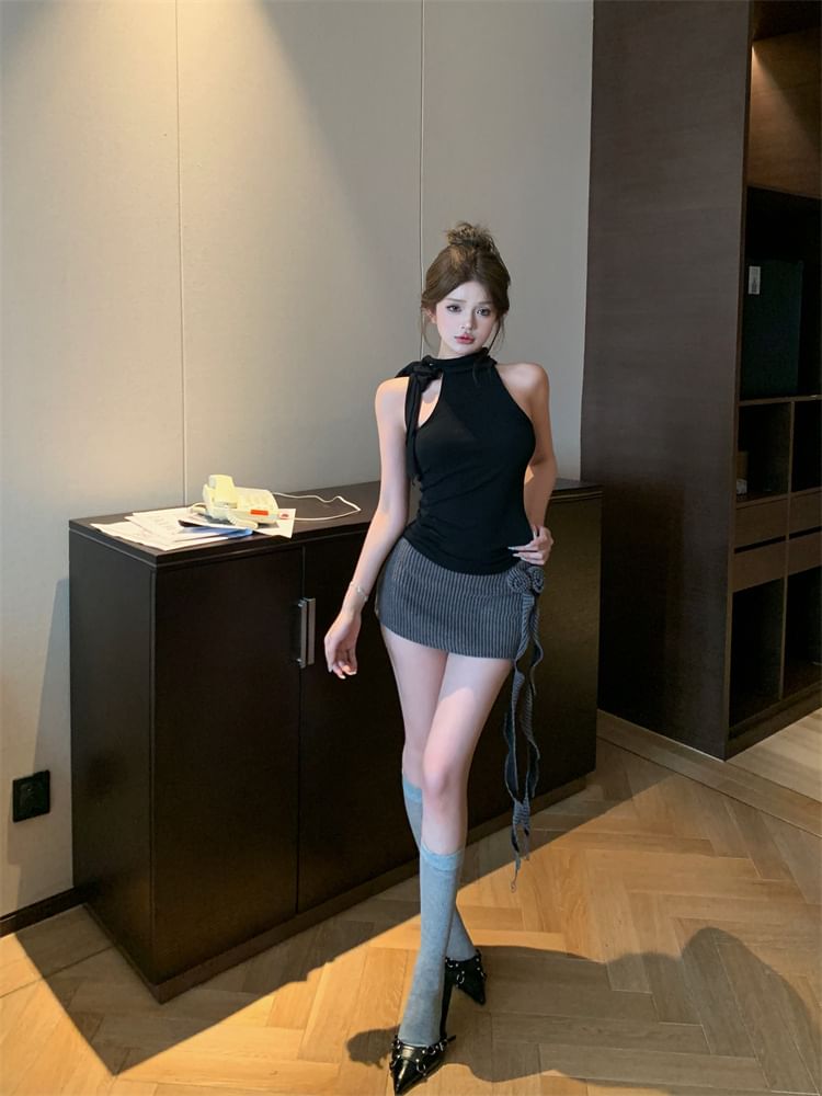 Mock Neck Plain Halter Top / Low Waist Flower Detail Mini Pencil Skirt