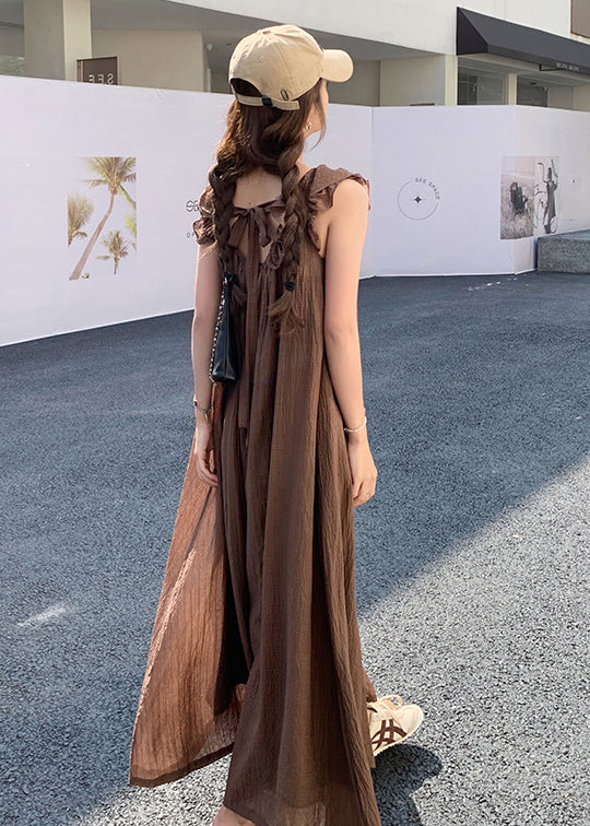 Women Coffee Ruffled High Waist Solid Cotton Jumpsuit Sleeveless MN042