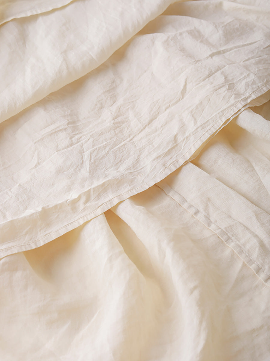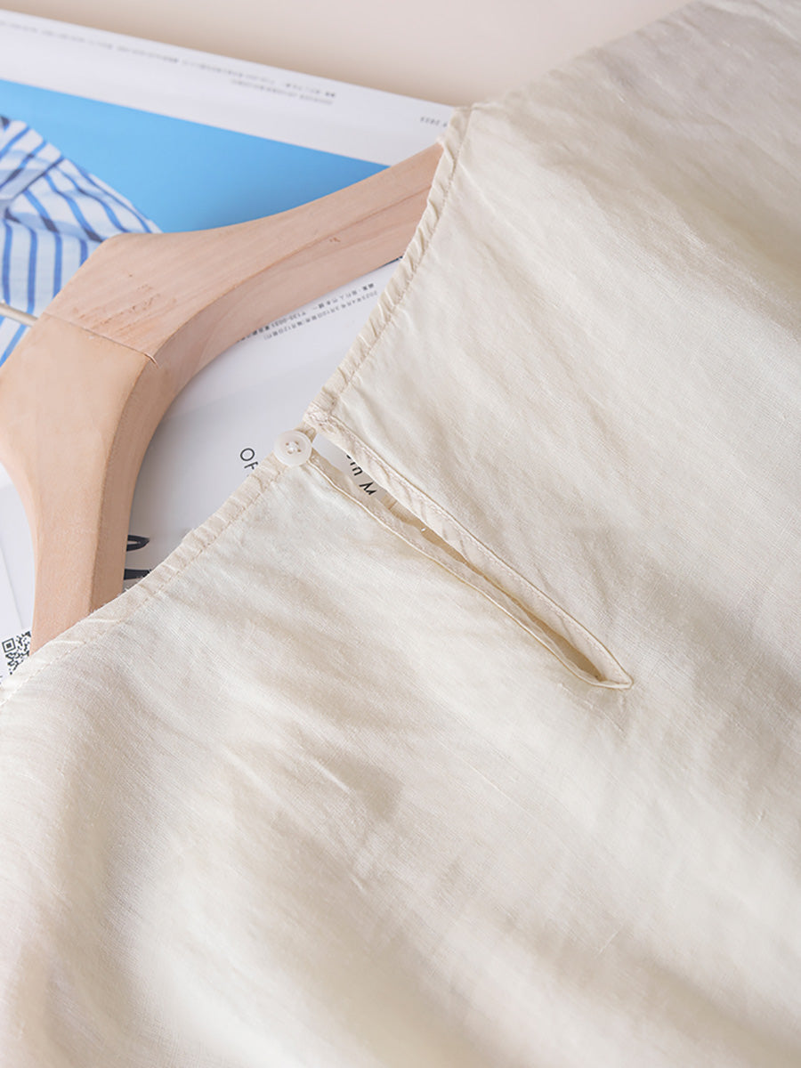 Women Summer Artsy Shirred O-Neck Lacework Ramie Dress CX030