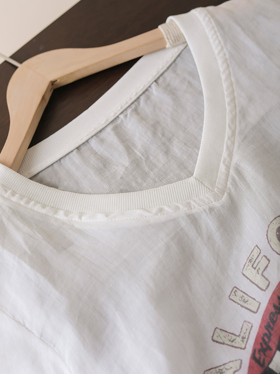 Women Summer Casual Print V-Neck Ramie Long Shirt LL022