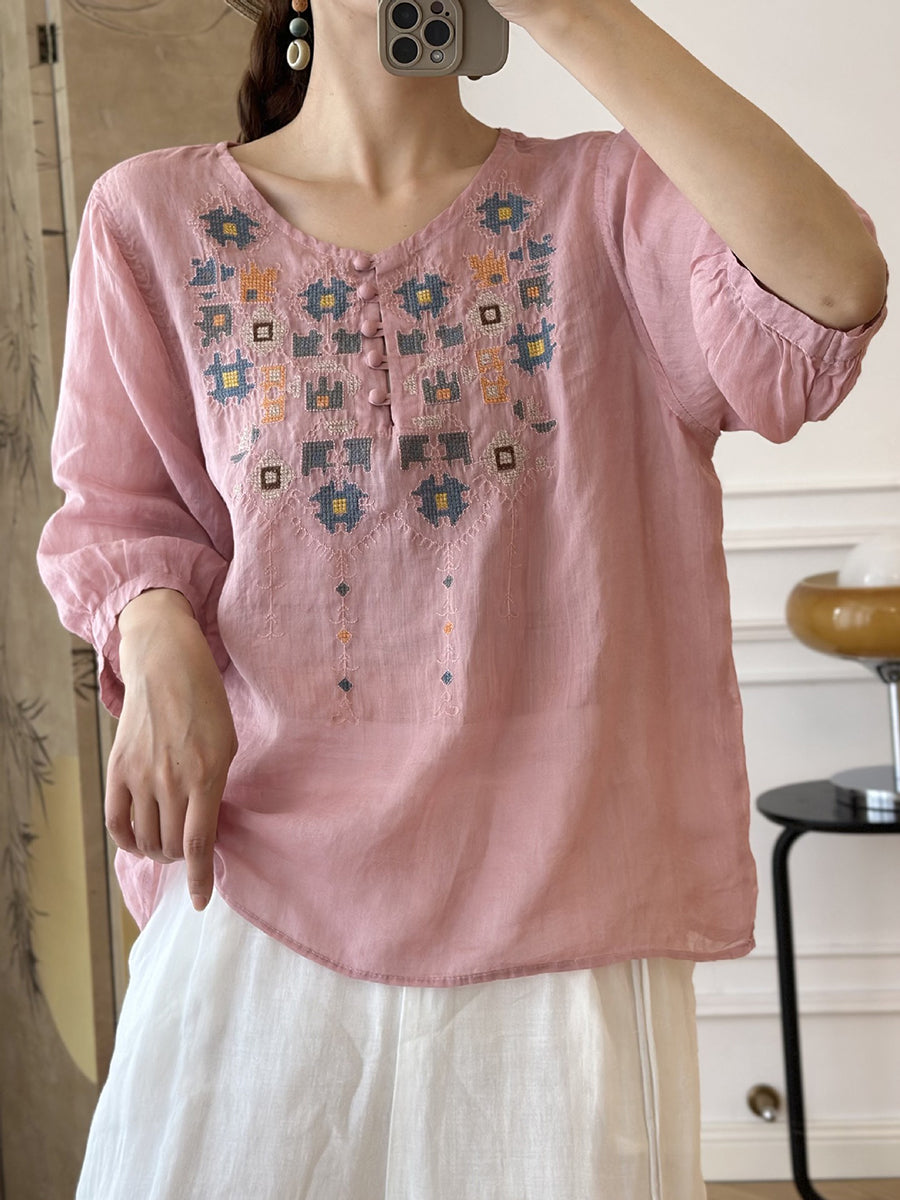 The Women Summer Artsy Embroidered Ramie Long Shirt boasts high-quality ramie fabric and detailed embroidery on the collar and sleeves. Its V-neck design, three quarter sleeves, and vintage aesthetic make it a must-have for the spring and summer seasons.
