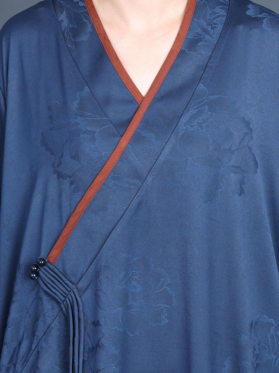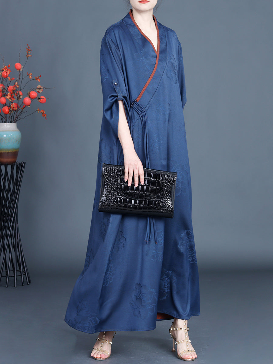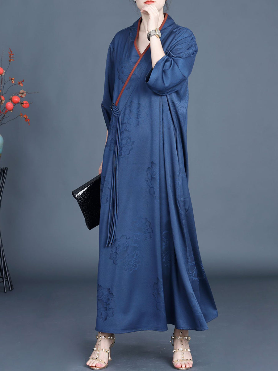 This exquisite robe dress boasts a v-neck collar and a stunning floral motif. The standard three quarter sleeves and ankle-length silhouette are elevated by the ornate jacquard accents, establishing it as the ideal addition to your summer ensemble..