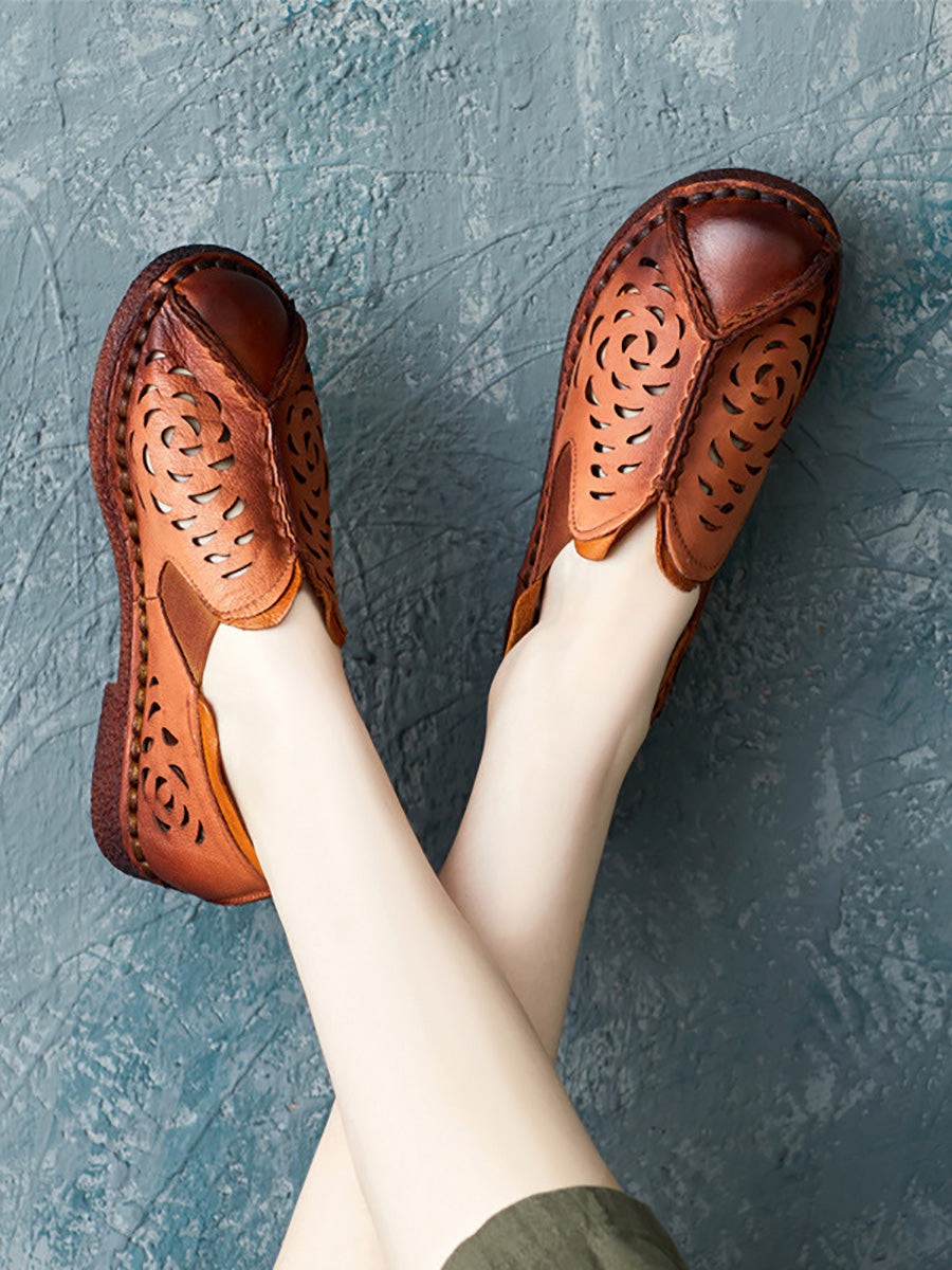 Women Summer Genuine Leather Cutout Spliced Falt Shoes LL003
