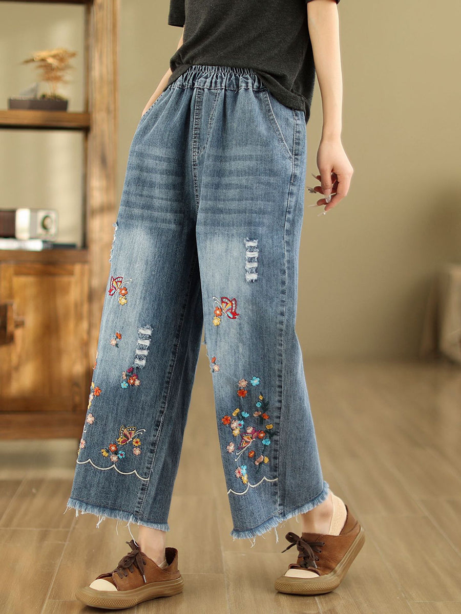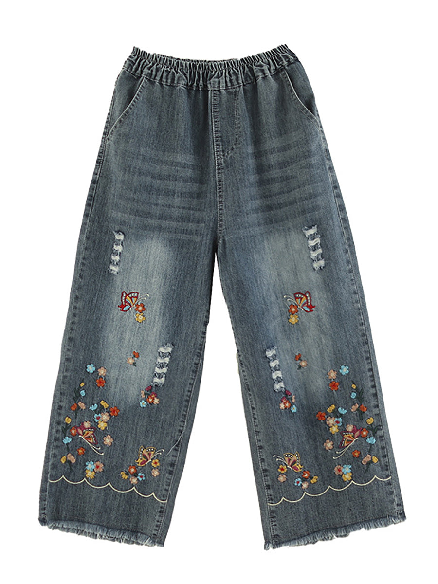Embrace elegance with our Women's Retro Embroidered Denim Pants. These high-quality pants feature delicate stitching and a classic design, providing both comfort and style with their elastic waist and straight cut. Perfect for spring and summer, these ankle-length pants add sophistication to any outfit.
