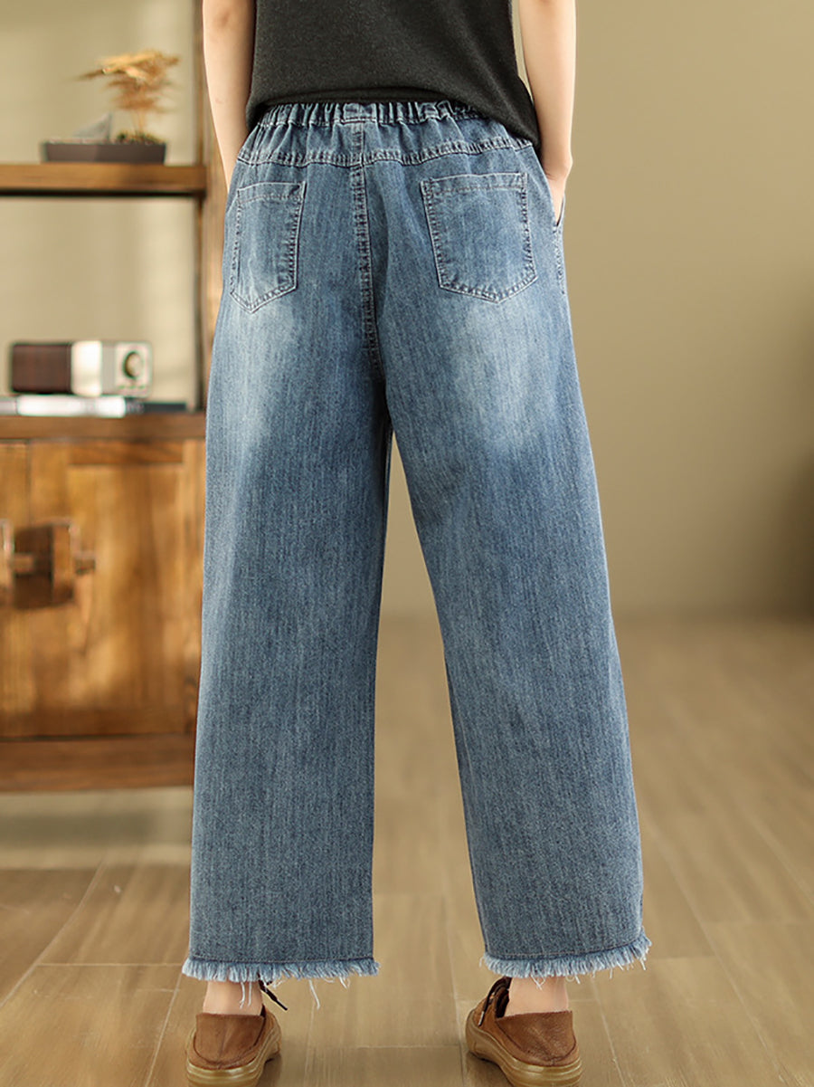 Women Summer Retro Embroidery Frayed Straight Denim Pants AS1042