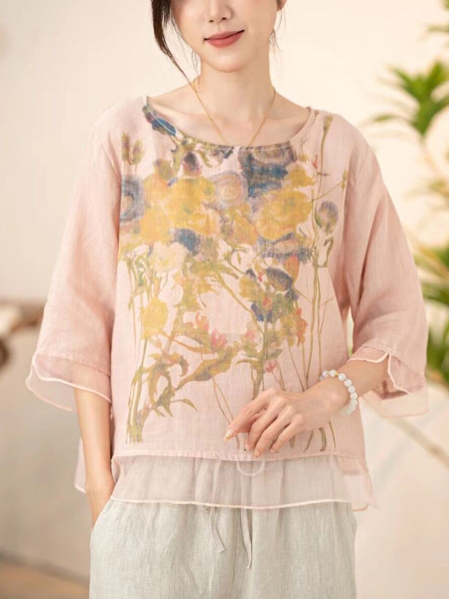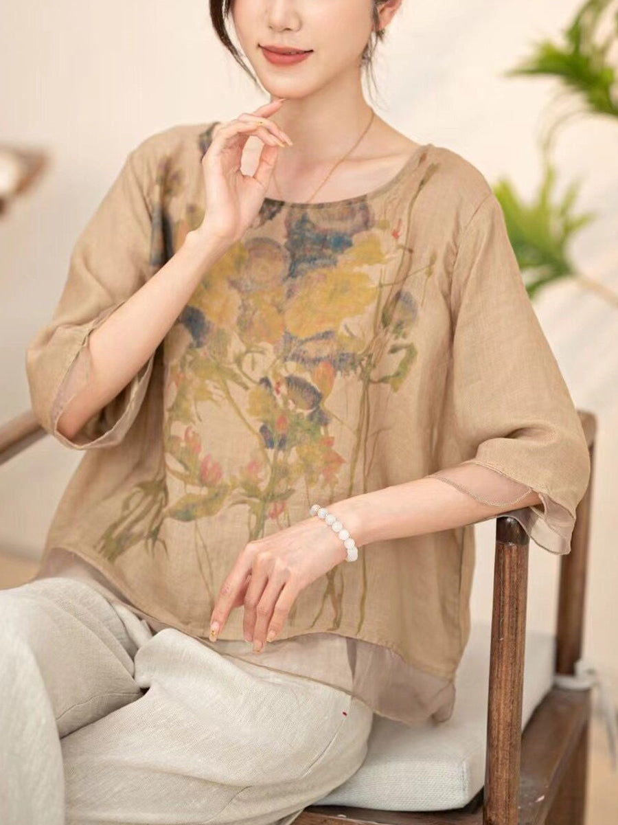 Women Summer Vintage Flower Spliced O-Neck Shirt XX1034