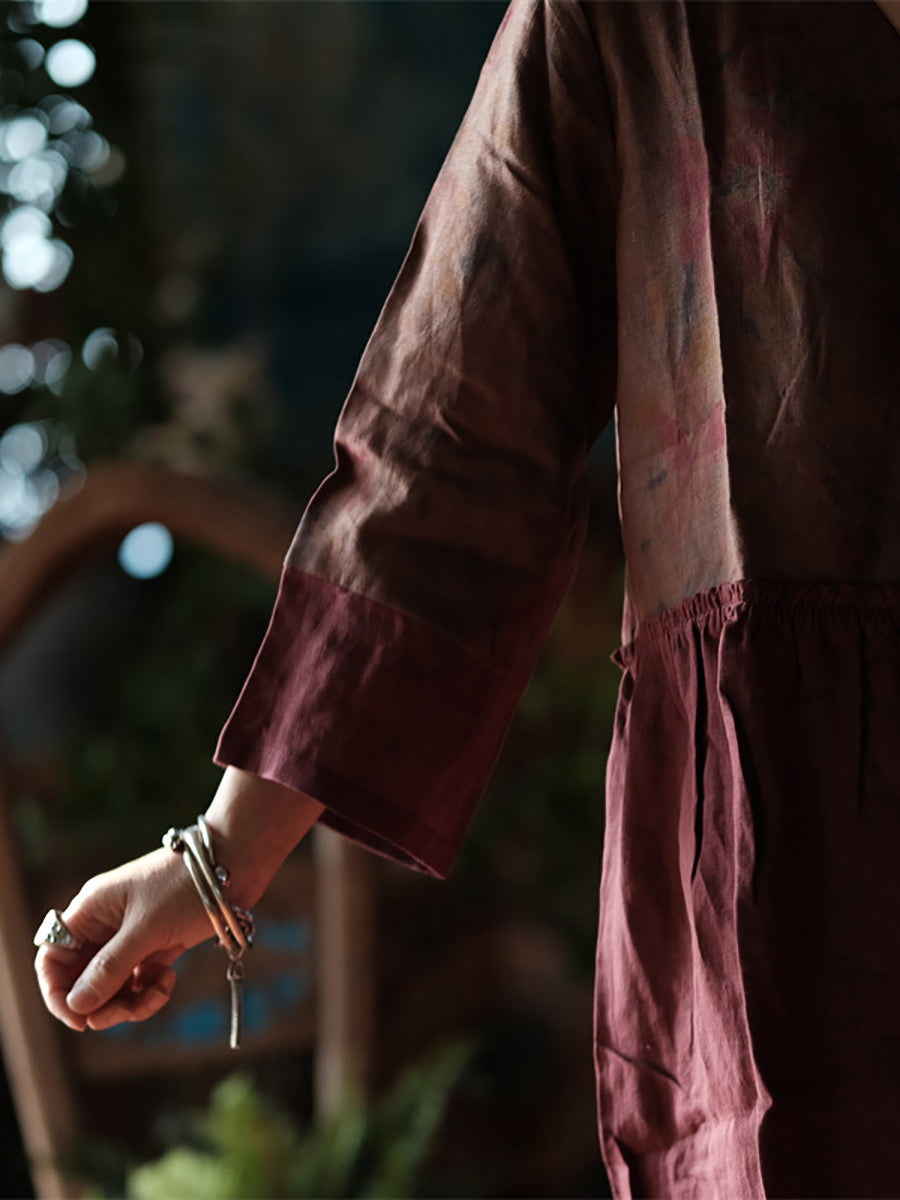 Women Summer Vintage Flower Spliced V-Neck 100%Linen Dress CX015