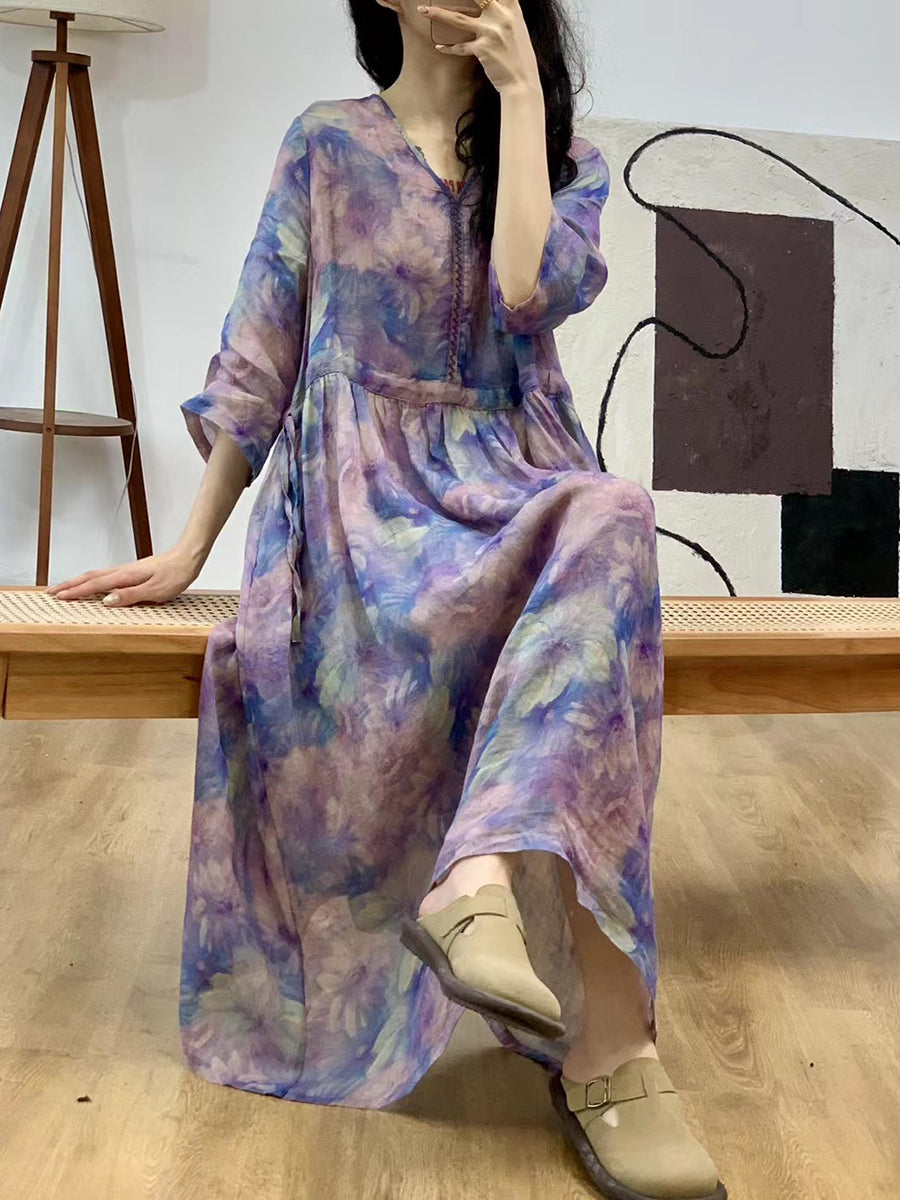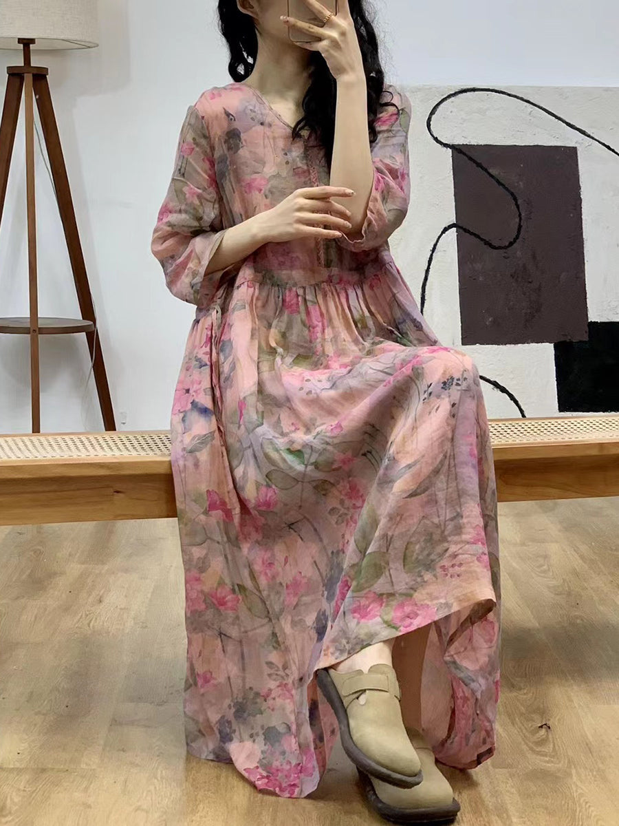 Women Vintage Floral Summer Ramie V-Neck Dress XX1028