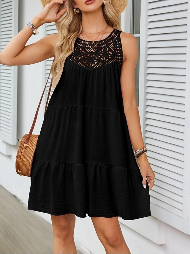 Dresses Type: Halter Dress, Fabric: Polyester, Gender: Women's, Design: Patchwork, Lace, Occasion: Outdoor, Going out, Style: Vacation, Casual, Print Type: non-printing, Fit Type: Loose Fit, Dress Length Type: Mini Dress, Neckline: Halter Neck, Sleeve Length: Sleeveless, Elasticity: Inelastic, Look After Me: Hand wash, Machine wash, Pattern: Solid Color, Season: Summer, Spring,