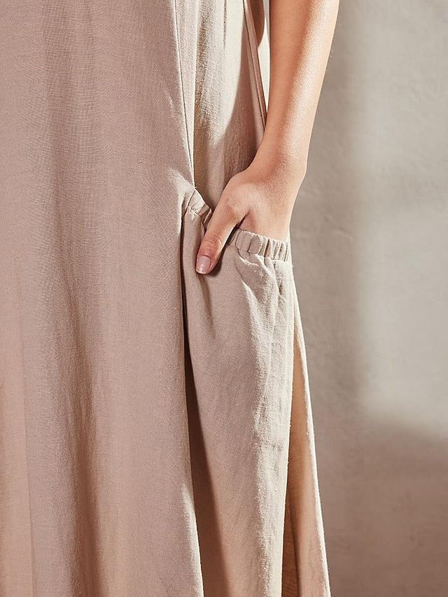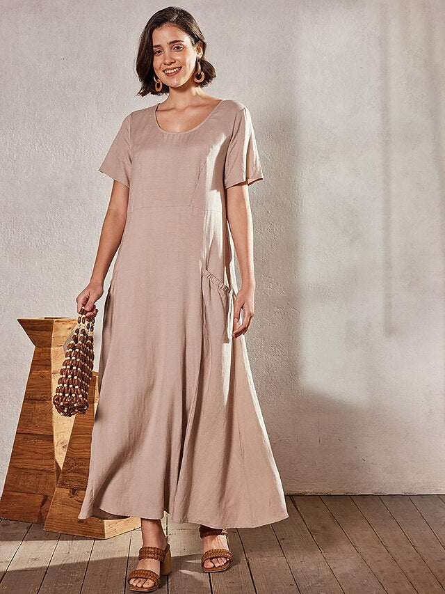 Dresses Type: Casual Dress, Faux Cotton Linen, Fabric: Cotton Linen, Gender: Women's, Design: Pocket, Occasion: Daily, Style: Solid, Print Type: non-printing, Fit Type: Loose Fit, Dress Length Type: Maxi long Dress, Maxi Dress, Neckline: Crew Neck, Sleeve Length: Short Sleeve, Elasticity: Micro-elastic, Look After Me: Machine wash, Season: Summer,
