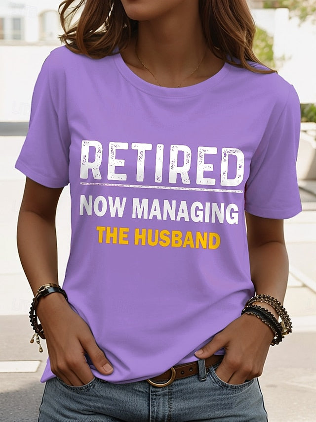 Fabric: Polyester, Tops Type: T Shirt, Gender: Women's, Design: Print, Occasion: Weekend, Daily, Style: Trendy, Casual, Classic, Stylish, Vintage, Category: T-Shirt, Fit Type: Form Fit, Neckline: Crew Neck, Round Neck, Sleeve Length: Short Sleeve, Elasticity: Micro-elastic, Look After Me: Wet and Dry Cleaning, Washable, Hand wash, Machine wash, Top Length: Regular Tops, Pattern: Graphic, Letter, Text Word: Retired, Season: Summer,